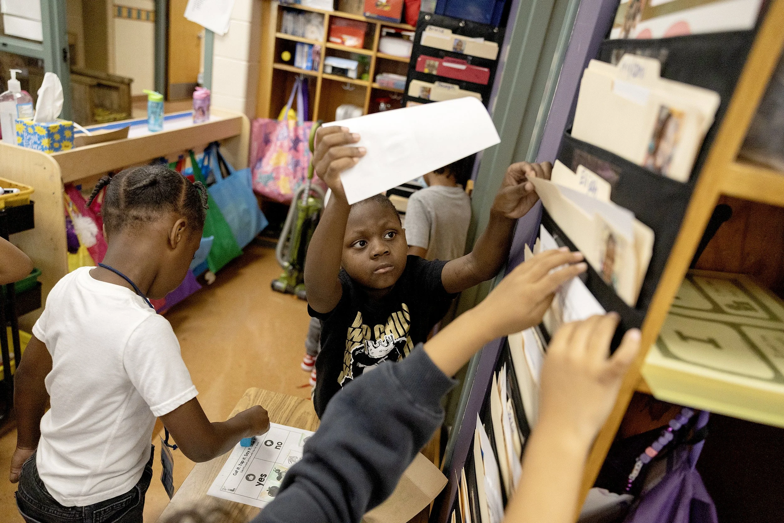 Lucy Laney kindergartener Elijah Wells reaches to turn in an assignment.