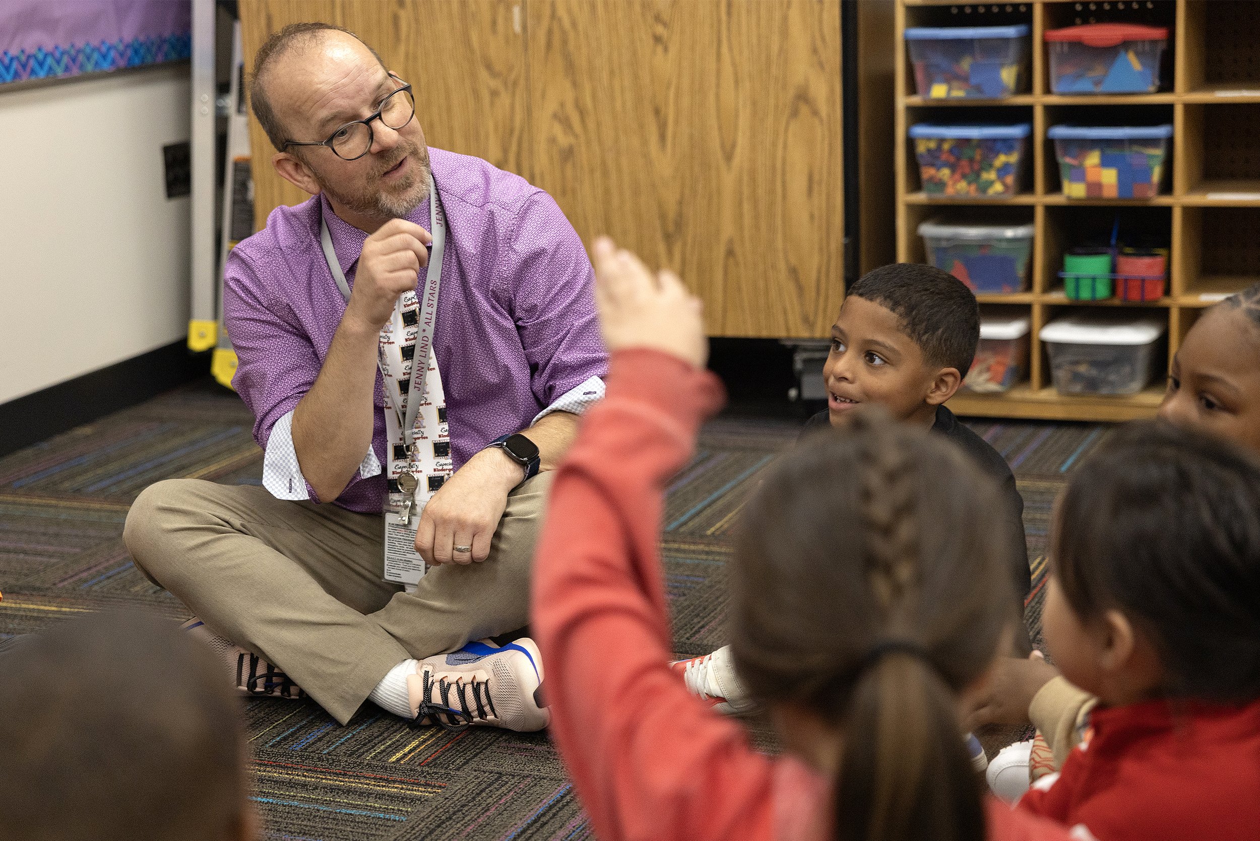 Jenny Lind kindergarten teacher Ryan Nelson had his class circled around him and gave students a chance to share something about themselves.