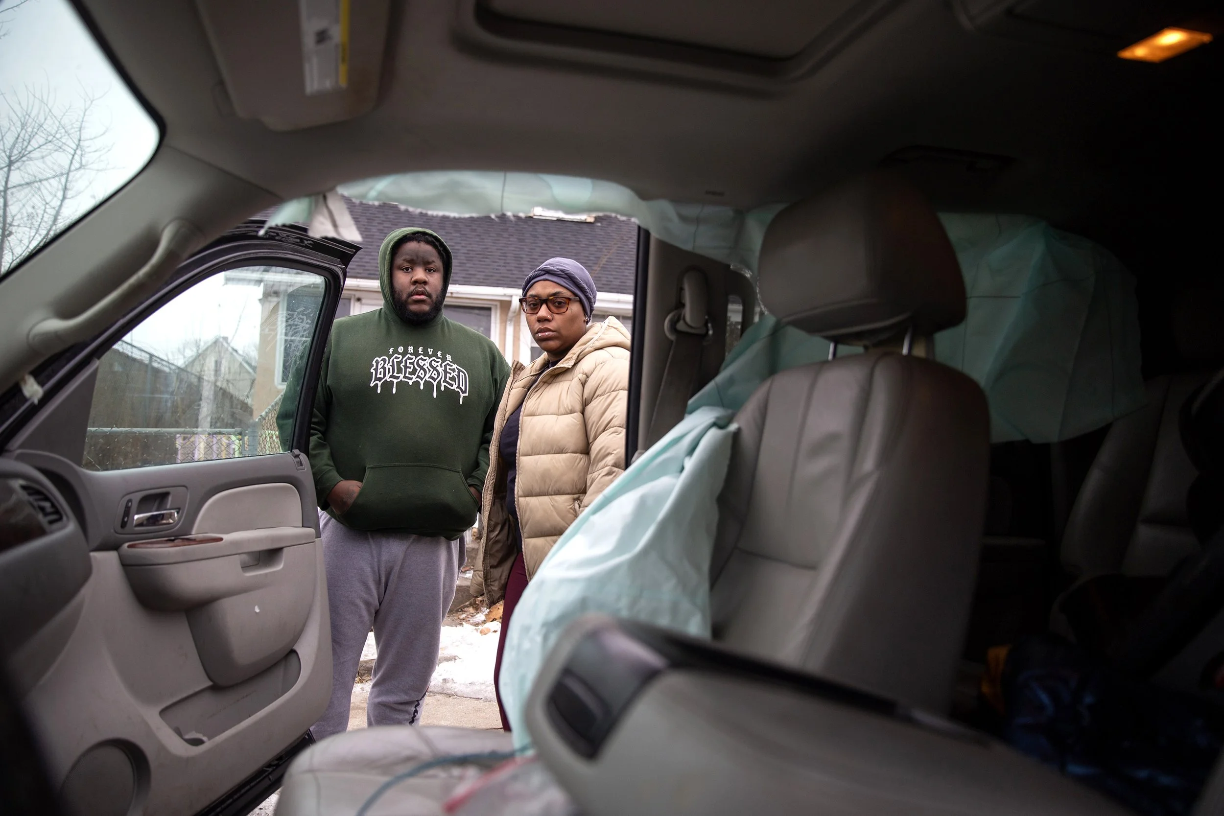 Shawn and Destiny Jackson pose in the door of their SUV that they were in when chemical irritants were deployed during the unrest in North Minneapolis on Jan 14, affecting them and their six children. Photo by Azhae’la Hanson