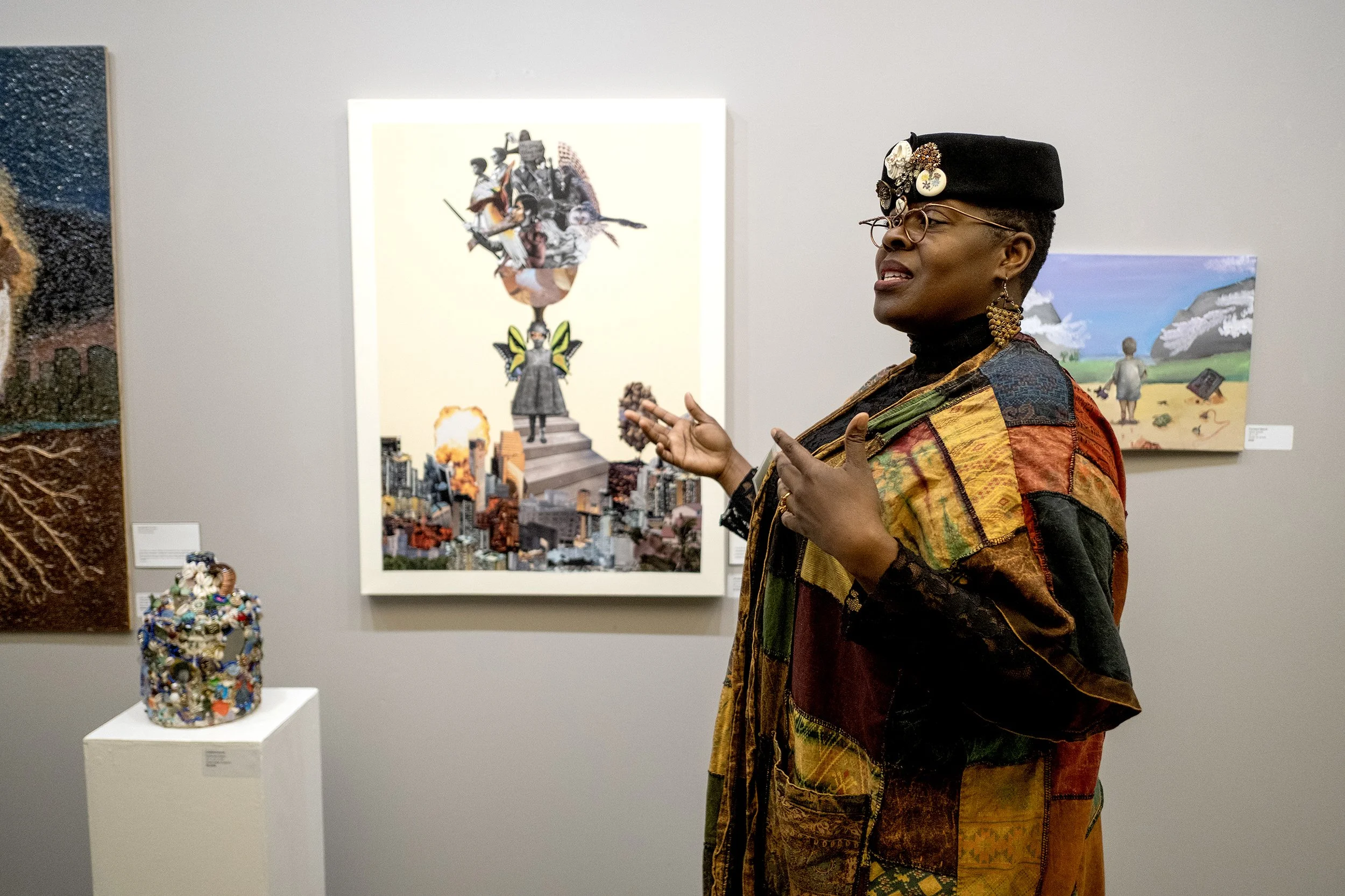 Evans routinely considers experience, community, and ancestry as part of her practice. Her works of collage and assemblage generated a steady buzz at the opening reception.