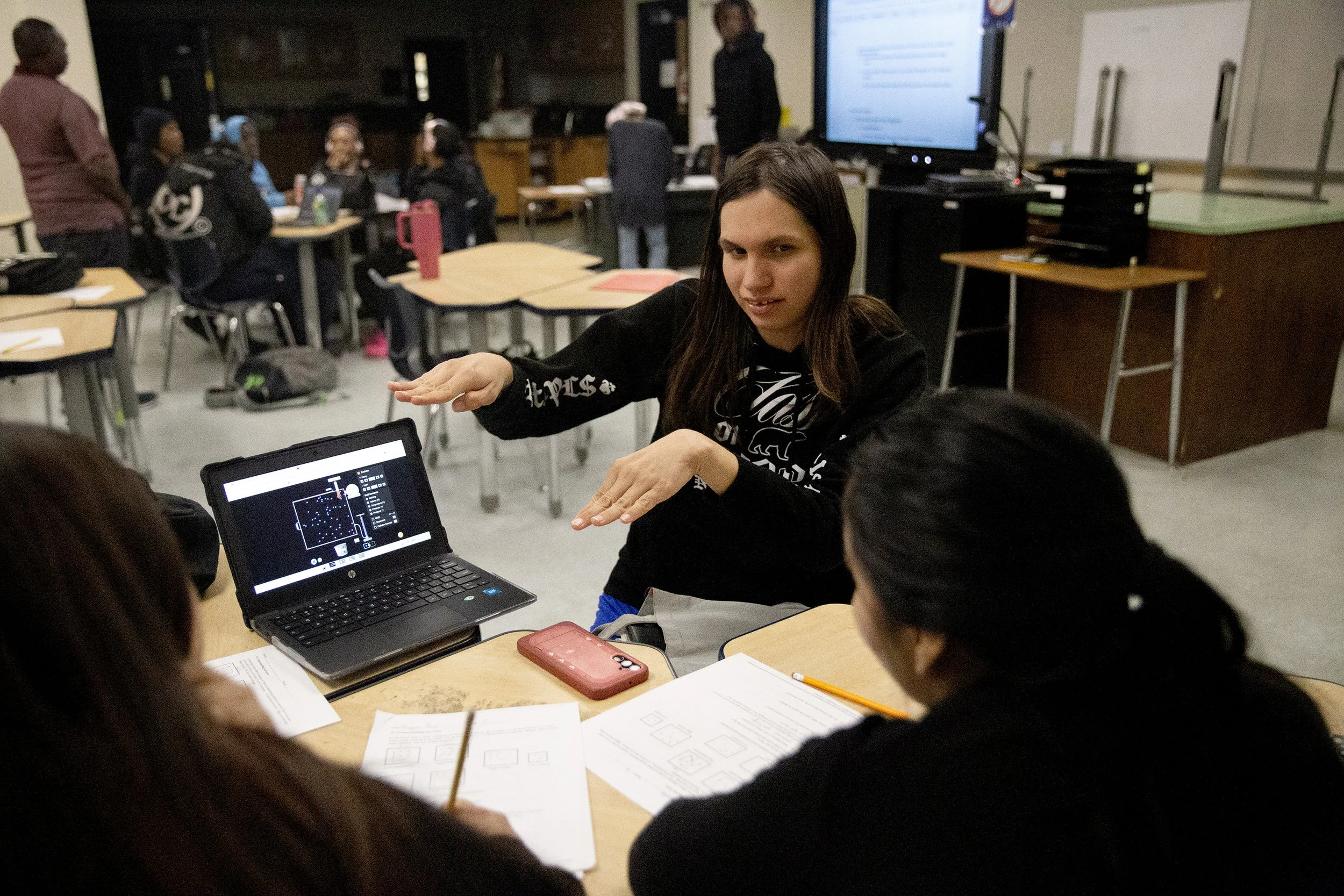 Gabby Benavente Hobart sits with students at the end of the third quarter to help catch up on work. Students came back from sheltering in place a week before the quarter ended. Photo by Azhae’la Hanson
